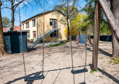 Unter dem Schatten der Bäume können sich die Kinder nach den Hausaufgaben auf Schaukel, Rutsche und Wippe austoben. Ein Wasserpumpe sorgt im Sommer für die nötige Abkühlung. Ein gemeinsam angelegtes Hochbeet mit allerlei Leckereien lädt zum Naschen ein.